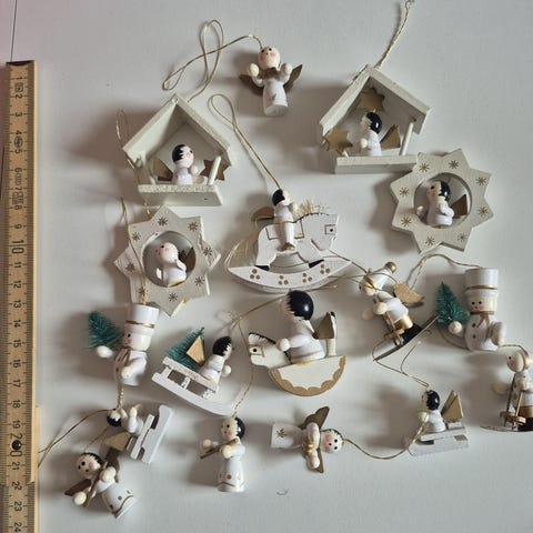 - Størrelse: Mellemstore figurer, ca. 6-8 cm lange/høje (se målestokken på billedet). Perfekte til at skabe blikfang på juletræet.