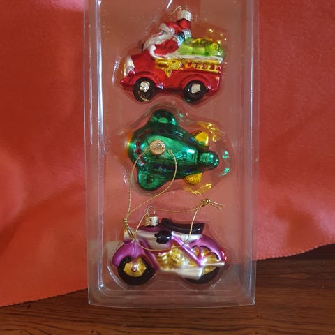 Et charmerende sæt med 4 flotte juletræsfigurer i træ, der forestiller klassiske transportmidler. Figurerne er malet i traditionelle julefarver (rød, blå, guld) og har et nostalgisk udtryk.
