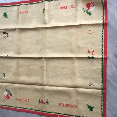 Juletræstæpper med trykte figurer, ikke forsøgt renset, sender gerne mod betaling af porto, prisen er pr stk