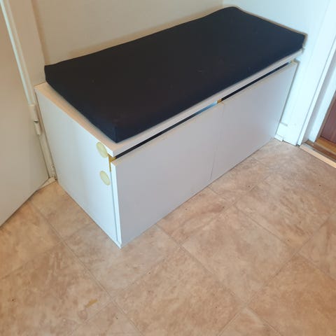 L: 195, D: 48, H: 34. Smuk, hvid skoreol/-bænk med ornamenter. Måske håndlavet, er relativt tung. Plads til 8-10 par sko samt selvfølgelig et ekstra lag på gulvet under bænken. Selve skohylden består af drejbare, hvidmalede metalstænger, hvor malingen en del steder er krakeleret. Se fotos hvor den krakelerede del er vendt så den er synlig og vendt så den ikke er. Selve bænkepladen er muligvis samme materiale som et køkkenskab, hvilket gør at overfladen holder sig pæn. Puder medfølger ikke.