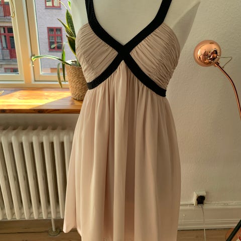 H&M Fest/cocktail kjole i sort med hvide prikker og hvide flæsedetaljer. Kjolen har lange ærmer og er i størrelse S. Materialet fremgår ikke, men kjolen er designet til kvinder.