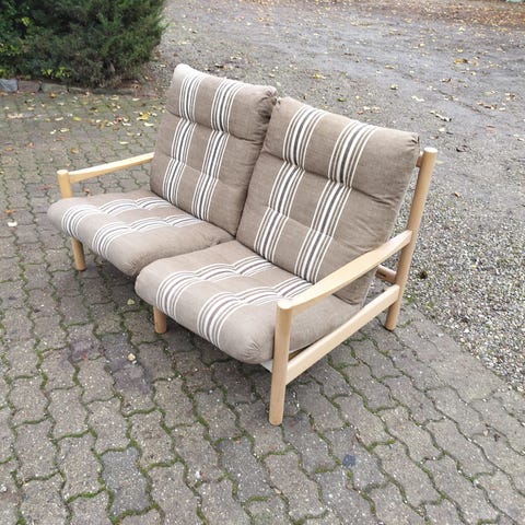 Sofaen er polstret med slidestærkt mørke gråt stof og har en lys gavl i ubehandlet eg.