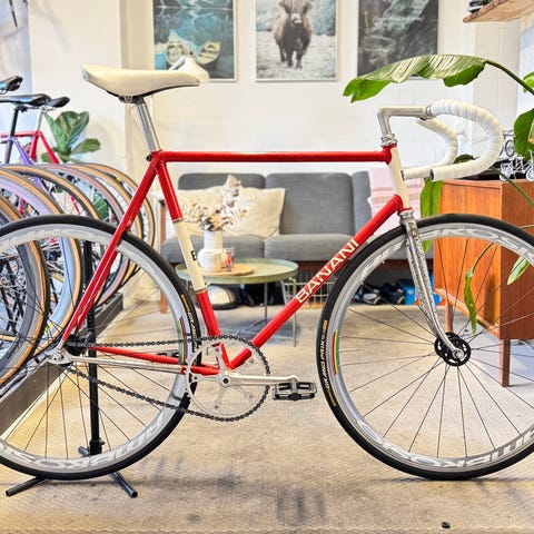 I rigtig god stand, fejler intet. Alt udstyr på billederne medfølger. Det er en original Banani racer bygget på et ægte Cinelli stel fra midt/slut 1980'erne. Håndbygget af ingeniør med gode dele fra bl.a. Campagnolo og Cinelli, fx er bagskifteren Campagnolo Chorus. De andre løsdele medfølger også. Størrelse 56. Skal afhentes i Vallensbæk.
