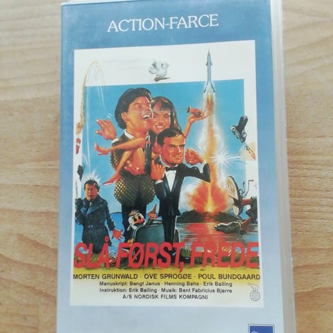 Slå Først, Frede VHS Film med dansk tekst. Indeholder filmen 'Slå Først, Frede' med skuespillere som Morten Grunwald, Ove Sprogøe og Poul Bundgaard. Filmen er indspillet i Danmark og distribueret af Nordisk Film. VHS-kassetteformat.