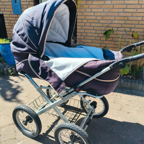 Dejlig stor barnevogn fra Odder. Der medfølger regnslag, myggenet, lammeskind og madres. Den er brugt men fejler intet. Skal støves af, har stået i vores carport.