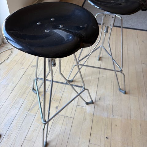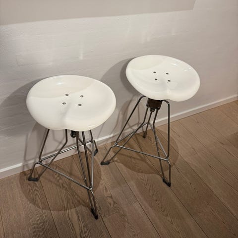 Barstole/stools fra engelske Dulton, designet af Yasu Sasamoto i 1970'erne. Kan justeres i højden fra 60 til 70 cm. I god original stand med lidt patina.