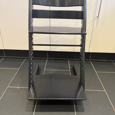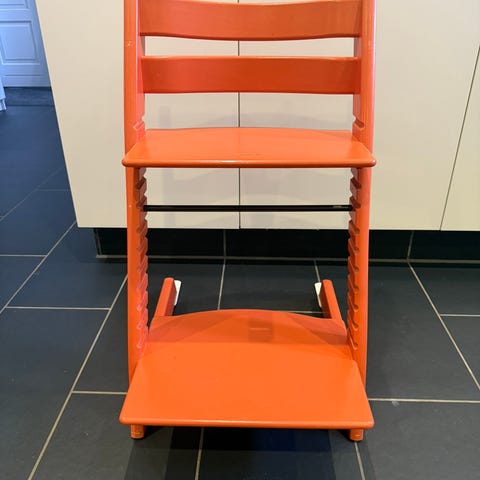 Stokke Tripp Trapp stol i limegrøn farve med grå babrindsats/bøjle. Stolen er professionelt lakeret og har fået klarlak, så rengøring er let.
