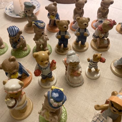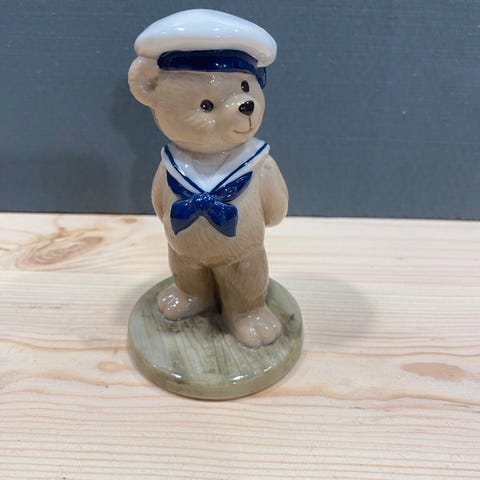 Bing & Grøndahl teddybjørn figur i keramik med rød halstørklæde og ørevarmere. Figuren er en del af Bing & Grøndahls Teddybjørn kollektion fra 1997.