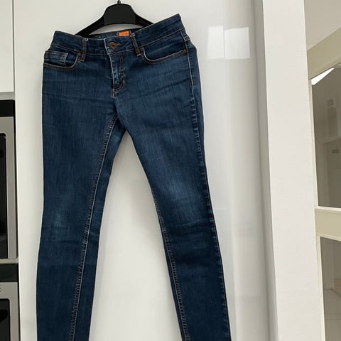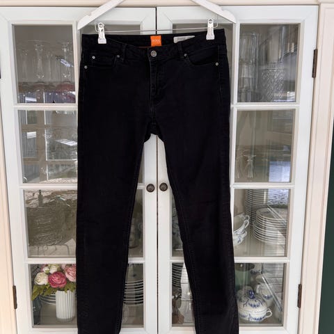 Sort dame jeans i størrelse S med taljemål W27 / 32.Jeansene har en tætsiddende pasform og er designet til kvinder.