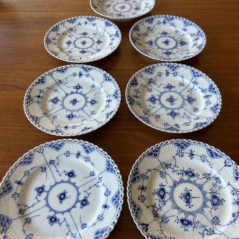 Fire Royal Copenhagen Musselmalet helblonde tallerken med en diameter på 27 cm, fremstillet i Danmark. Tallerkenen har et klassisk blåt mønster med helblonde kant. Velegnet til servering af mad og som del af en porcelænssamling. Prisen er stykpris.