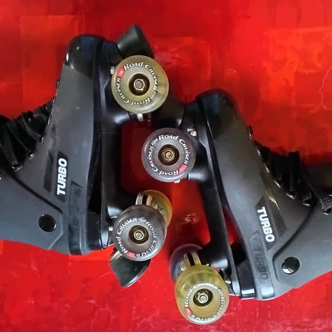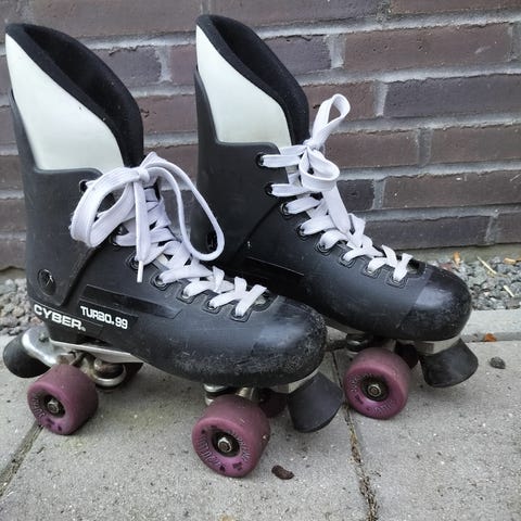 Side by side Cyber Turbo 99 rulleskøjter. Ruller stadig super godt. Har lidt små ridser hist og pist, men er i det store hele pæne. Fra røgfrit hjem.