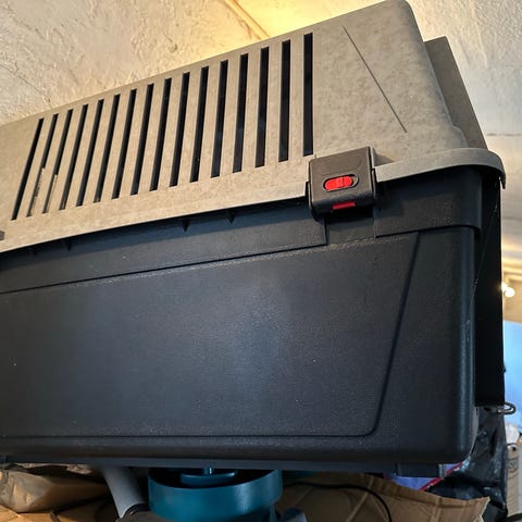 Passede til vores 28kg hund for at flyve over Atlanterhavet. Vandskål og “live animals” skilt inkluderet