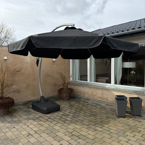 Monza hængeparasol med en størrelse på 300x300 cm i antracit farve. Parasolens stel er lavet af kryds- og plastfod, og den har en diameter på 300 cm med en højde på 270 cm.