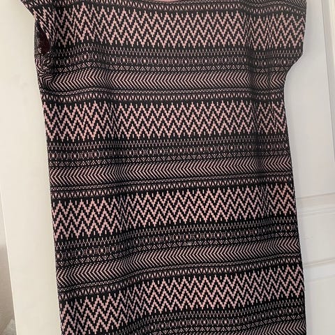 Sort kjole med kort ærme og rund hals. Der er et mønster i stoffet