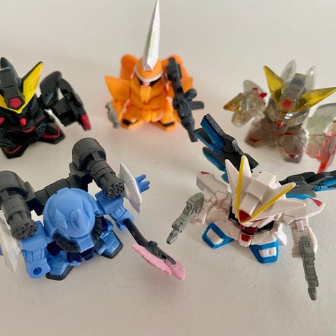 Sæt med fem Gundam figurer. Perfekt til samlere eller fans af Gundam-serien. Sættet indeholder forskellige karakterer og mechs fra Gundam-universet.