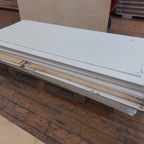 Krydsfinérplade 122x228cm 15mm. Genbrugsplade som har skruehuller. og hul i toppen af pladen på Ø100 placeret så underkant hul er 165mm fra top plade. Kan have gammel fugemasse og kosmetiske vandskjolder. Dimension B:122 X H:228 X D:1,5cm