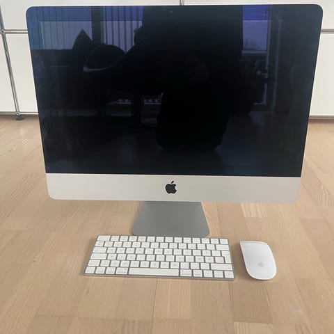 Apple iMac stationær computer i sølvfarve. Inkluderer Apple Magic Keyboard og Magic Mouse.