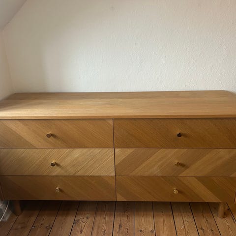 Kommoden er i sin tid købt som udstillingsmodel og har en mindre revne i bordpladen samt et rundt mærke (som ikke har nogen funktionel betydning). Mærket kan måske slibes væk.