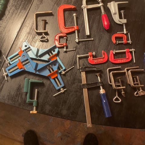 Turnus DIN 5117 skruetvinger og håndværktøj sæt bestående af flere skruetvinger, hamre, økse og forskellige træværktøjer. Værktøjet er fremstillet af metal og træ og viser brugsspor. Sættet indeholder forskellige størrelser og typer værktøj til håndværks- og reparationsopgaver.
