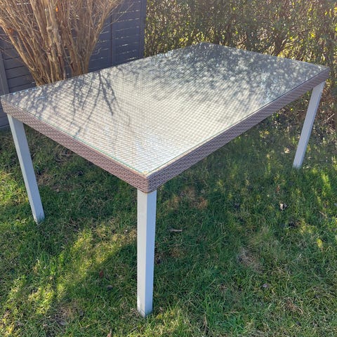 Glasbord med rund bordplade i hærdet glas og stel i sort metal. Bordet har fire ben med forstærkning og er velegnet til både indendørs og udendørs brug. Diameter på bordpladen er Ø 60 cm. H. 72 cm.
