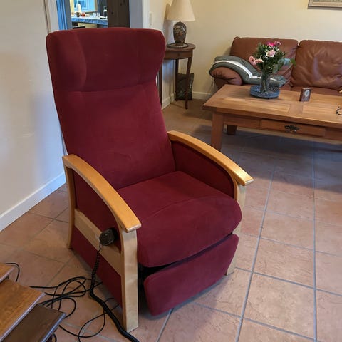 Elektrisk hvilestol med Antracit stofbetræk og indbygget fjernbetjening til justering af ryglæn og fodstøtte. samt løfte funktion Stolen har polstrede armlæn og er designet til komfort og funktionalitet i hjemmet. er ca 3år gammel kan se at lyset kommer ind på stolen og gir en anden farve stolen er antracit og ikke to farvet