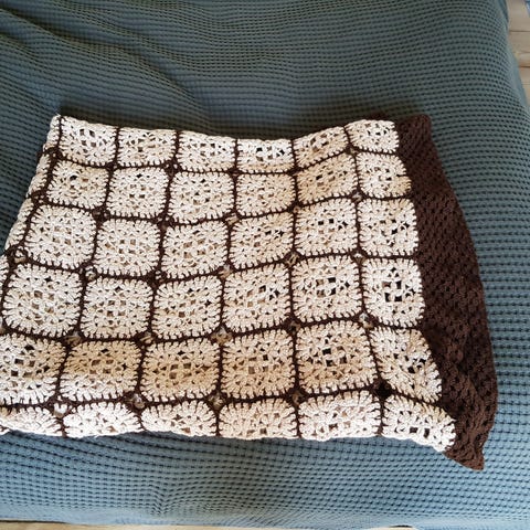 Skønt lille tæppe hæklet i uld i lilla nuancer. Mål:73x82