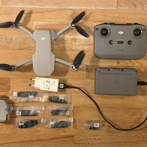 DJI mini 2 drone i grå farve med fjernbetjening. Inkluderer batteri, opladere, kabler og bæretaske. Dronen er foldbar for nem transport og opbevaring. Egnet til luftfotografering og videooptagelse. Kompatibel med tilbehør til opladning og dataoverførsel.