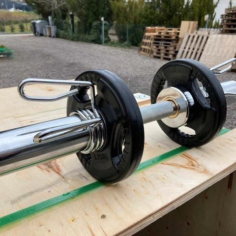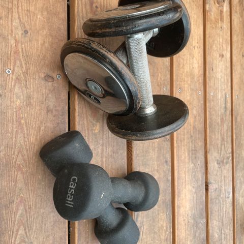Casall Dumbbell Sæt med vægtskiver i stål sælges. Sættet inkluderer forskellige vægtskiver og en håndvægtstang med låsemøtrikker. Materialet er robust stål, og sættet er velegnet til styrketræning.