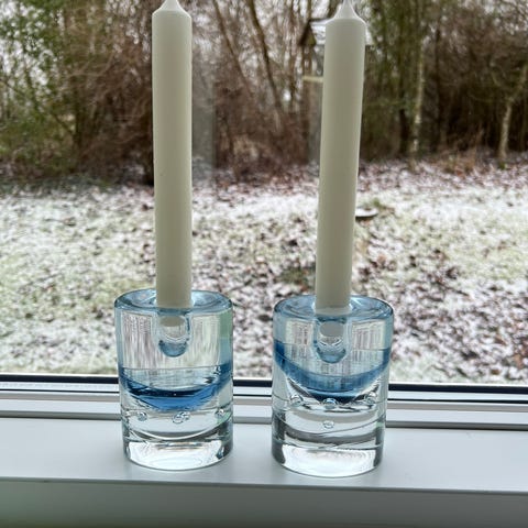 lysestage er i gennemsigtig glas og blå.