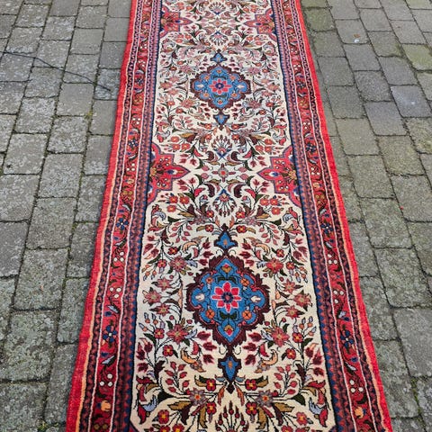 Ægte Persisk håndknyttet Bidjar Løber, 62 x 247, uld på bomuld, nyrenset og i excellent tilstand uden slitage eller falme. Flot "all-over" blomstrede mønster med en koral-farvede bund og farvede highlights blå, gul og andre farver. Deligt robust løber som vil være begge flot of praktisk i en gang.