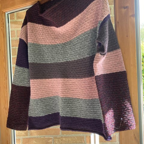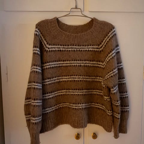 Str S. Retro Isager model sælges. Strikket af min mor for en del år siden. Ikke brugt ret meget. Design: Kirsten Toftegaard. Modellen hedder Elisabeth. Strikket i original Isager garn (tvinni - på tynde pinde). Jeg har bare alt alt for meget strik og er nødt til at lave plads i skabene.