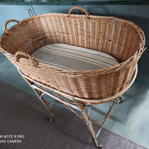 Sælger denne kurvevugge. Hjulene er lidt drilske. De er tapet fast og ellers kan de nok tages af, hvis den får en fast plads.