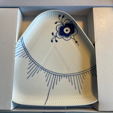 Royal Copenhagen Blå Mega fad i porcelæn med blå dekorative mønstre. Fadet har en rektangulær form og kan anvendes til servering eller som dekoration. L 24 cm, stempel med nr. 377. Sender gerne pp