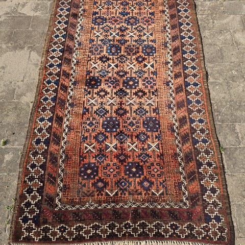 Ægte Persisk håndknyttet Balouch tæppe, 89 x 142 cm, uld på uld, nyrenset og i meget god tilstand uden slitage eller falme. Flot livets træ mønster indrammet af portvin rød, orange og mørkblå geometriske mønstre. Dejligt tyk og blød uld.
