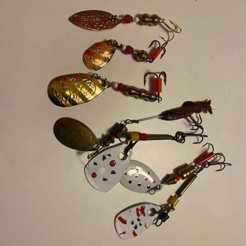 Fiskegrej bestående af to fiskeforfang med to forskellige agn. Den ene agn er blå med pink og lilla detaljer og har en blød hale, mens den anden agn er sølvfarvet med røde detaljer. Begge agn har kroge til fiskeri og kan bruges til forskellige fiskearter.