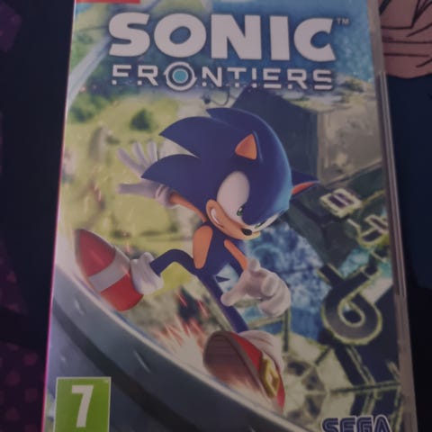 Sega Sonic Frontiers Nintendo Switch-spil. Spillet har aldersanbefaling 7+, og det er et action-eventyr spil med Sonic som hovedperson. Spillet understøtter singleplayer og har en åben verden, hvor spilleren kan udforske forskellige områder.