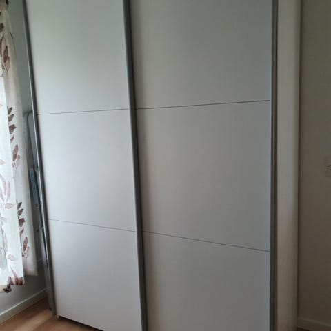 Gråt skab med to skydedøre og indvendige hylder. opbevaringsløsning med en glat overflade. . Velegnet til opbevaring i hjemmet eller kontoret. Enkelte skrammer på oversiden.