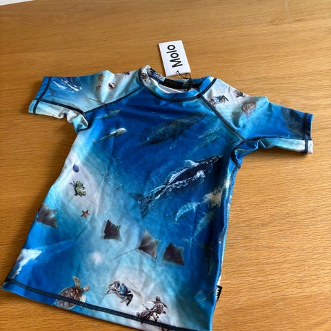Badebluse til aktive børn fremstillet i genanvendt polyester med UV-beskyttelse 50+. Blusen har en tætsiddende pasform, opstående krave og lange raglanærmer. Den er behagelig at have på i det strækbare materiale.