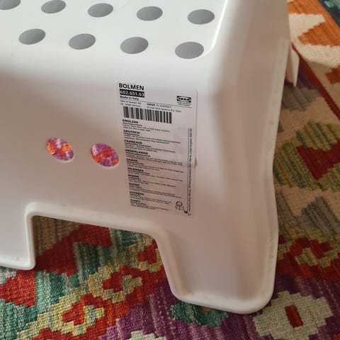 IKEA BÖJA børneskammel i hvid plast med grønne skridsikre punkter på overfladen. Skamlen er designet til børn og velegnet til brug i badeværelset eller andre steder, hvor børn har brug for et ekstra trin. Godkendt til 35 kg