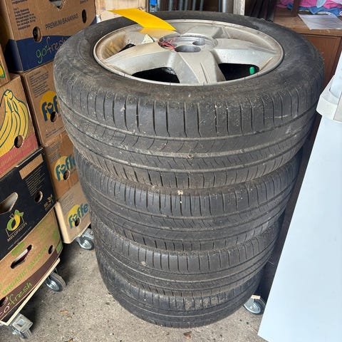 Continental dæk med fælge i størrelsen 205/50 R16. Dækkene er beregnet til personbiler og har stålfælge med flere huller til montering. Dækmønsteret er synligt på billederne og viser dækkenes slidmønster. Dæk og fælge kan anvendes til almindelig kørsel under normale vejforhold.