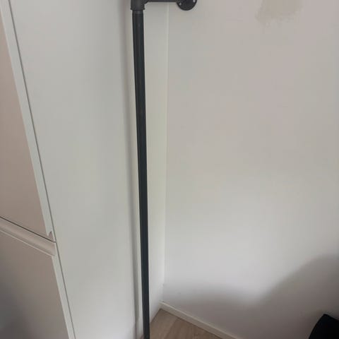 Væghængt RackBuddy tøjstativ i vandrør med hylde i mørk eg.