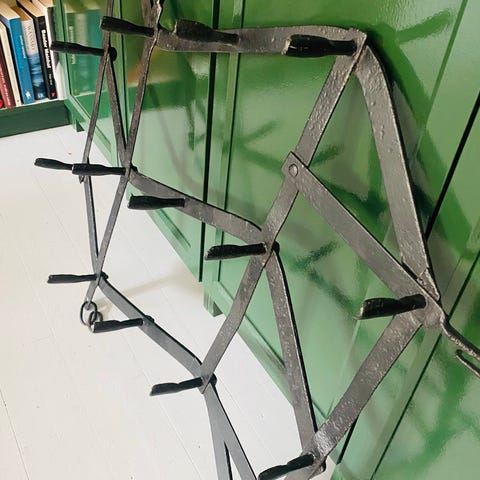 Med patina, på svejsede knopper på tænderne, som ellers er meget spidse. Dette gør den ufarlig og velegnet til ophængning i f.eks. et hjem. Målene er, max. Højde 77 cm, max bredde 64 cm, dybde fra væg 12,5 cm, selve tænderne er inkl. knop 9,5 cm lange, vægt 7 kg. Kan f.eks. bruges som dekoration eller hængt på tværs som avanceret knagerække, eller forsynes med smalle træhylder ved lodret ophængning – kun fantasien sætter grænser. NB. Sendes ikke men kan ses i Finlandsgade på Amager