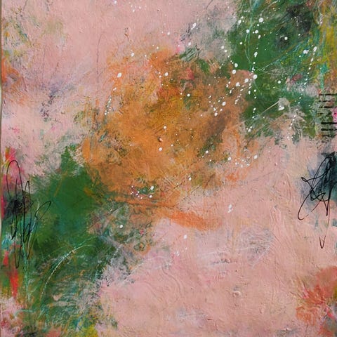 Akrylmaling, tusch, farver & mønsterpapir på kraftigt papir, til at sætte i en ramme.