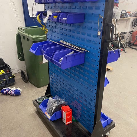 Boltreol, værkstedsreol, Blika med 10 rum og er 65 cm høj, 50 cm bred og 16 cm dyb. Har to stk som er i rigtig pæn stand. Sælges samlet for 1150,-. Pris pr stk 650.