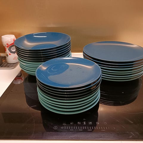 Mit stel har enkelte brugsspor på nogle tallerkener, men er ellers i fin stand.