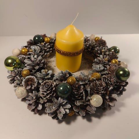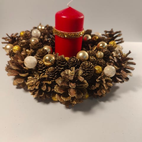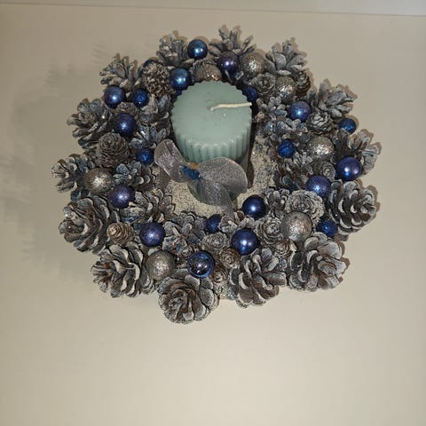 Smuk julelysestagen i blå i sølv. Håndlavede med helt eget design, og helt igennem unikt. Lavede af ægte kogler og dekoreret med små julekugler og glitter. På billederne ser de ikke så smukt som i virkeligheden.