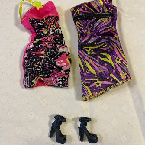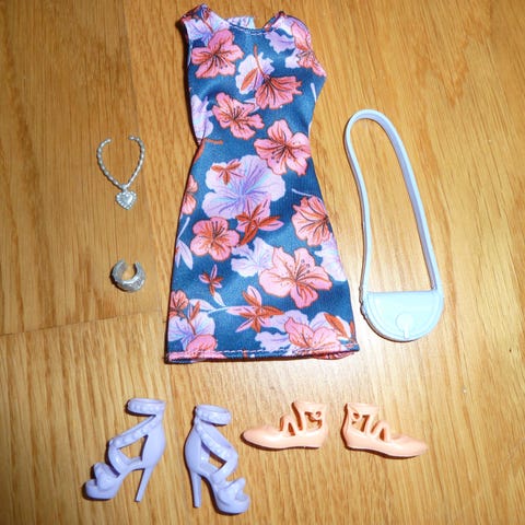 Barbie Prinsesse Kjole sæt inklusive pink kjole med guld detaljer, pink sko, pink taske og hjerteformet tilbehør. Passer til Barbie dukker, designet til leg og udklædning.