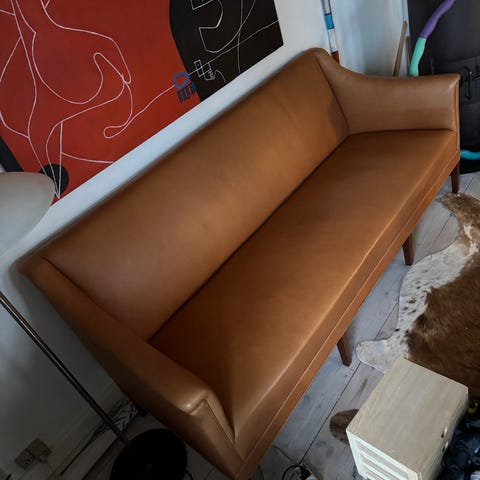 Glasfiber og ægte læder fra 1970erne, købt i Finland, brugt i Bellevue Teatret. Anbefales at hynder indlæg skiftes.