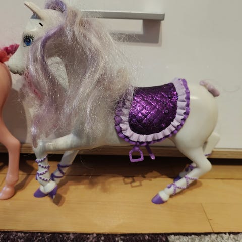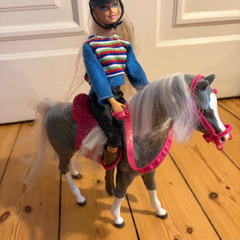 Barbie Legetøj Hest med blå saddel, seletøj og detaljer. Hesten er fremstillet i plastik med blå man og hale. Egnet som legetøj til børn.