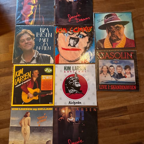 Kim Larsen vinylplader med forskellige albumudgivelser. Pladerne er i standard størrelse og indeholder musik fra Kim Larsen. Egnet til samlere og musiklyttere.